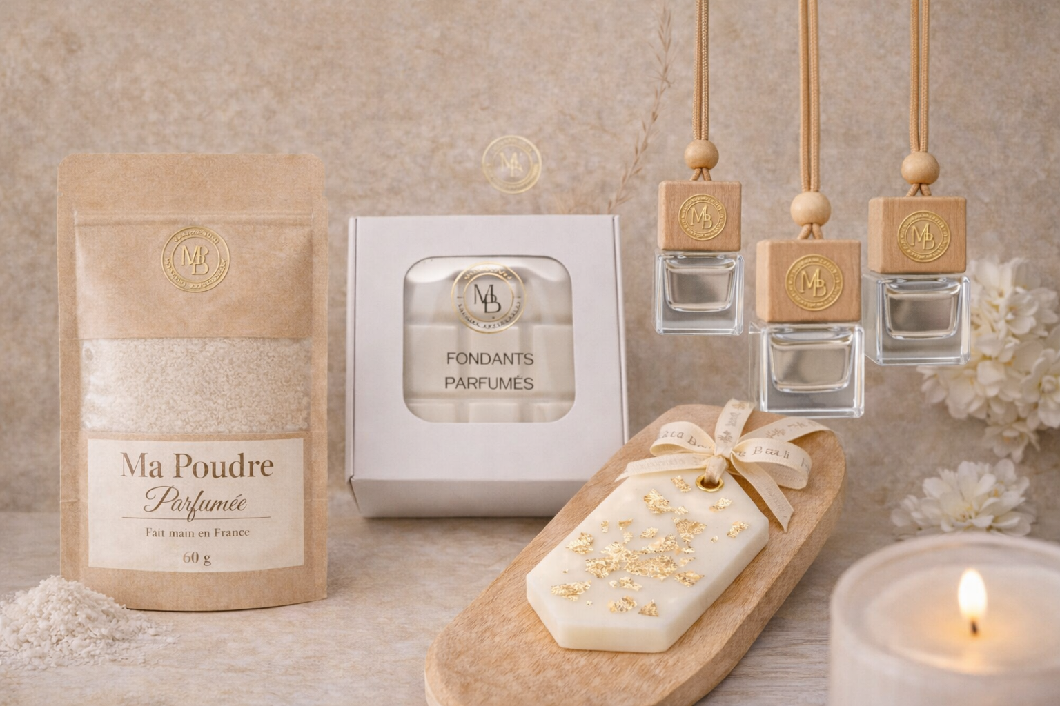 Des créations parfumées pour sublimer chaque espaces : fondants, poudres d'aspirateur, tablettes parfumées et parfums pour voiture.